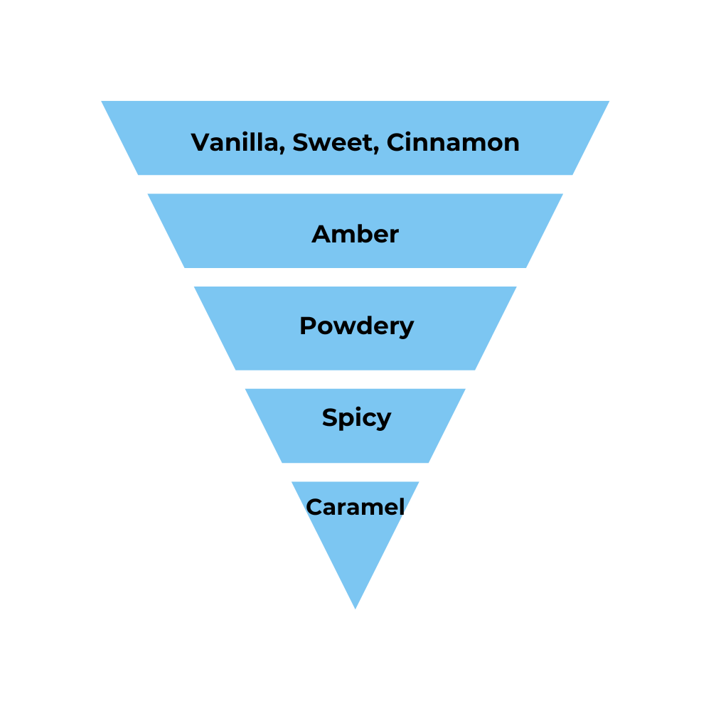 Amber fragrance with accords of fruity, citrus, sweet, musky, powdery, vanilla, amber and fresh spicy notes