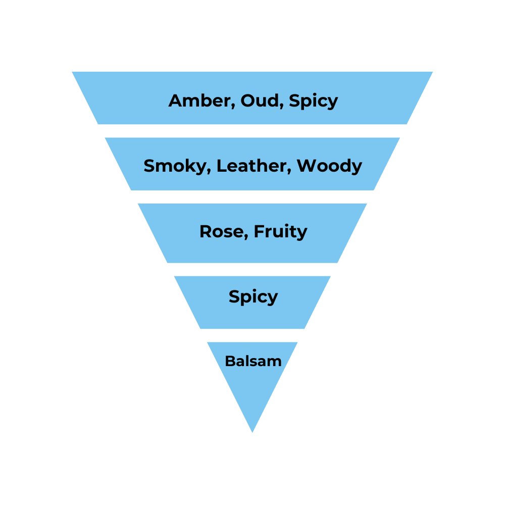 Amber, Oud, Warm Spicy, Smoky, Rose, fruity, Leather, Woody, Balsamic, and sweet notes. With its lavish and long-lasting scent, this car freshener will elevate your driving experience to new levels of luxury.