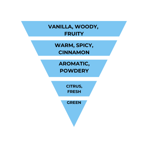 Woody spicy notes and accords of fruity, vanilla, warm spice, cinnamon, aromatic, powdery, citrus, fresh, and green.